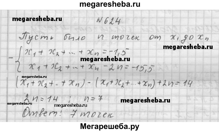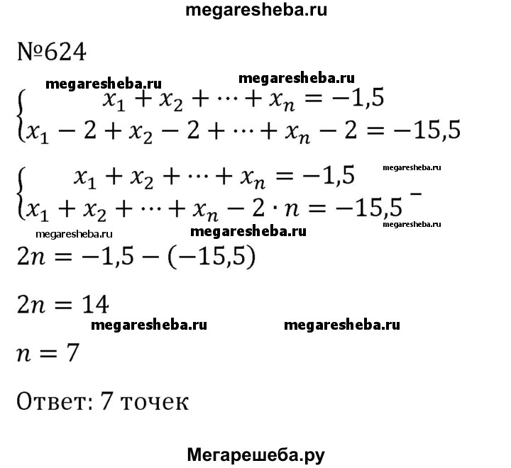 624. На координатной оси отмечено несколько точек. Сумма чисел, соответствующих этим точкам, равна -1,5. Каждую из указанных точек переместили по координатной оси на две единицы влево, после чего сумма чисел стала равной -15,5. Сколько было точек?
