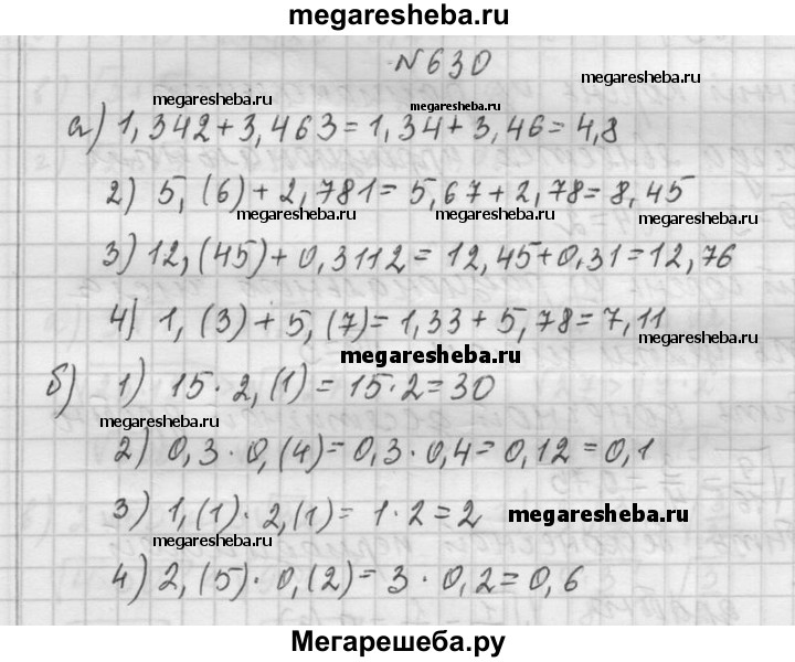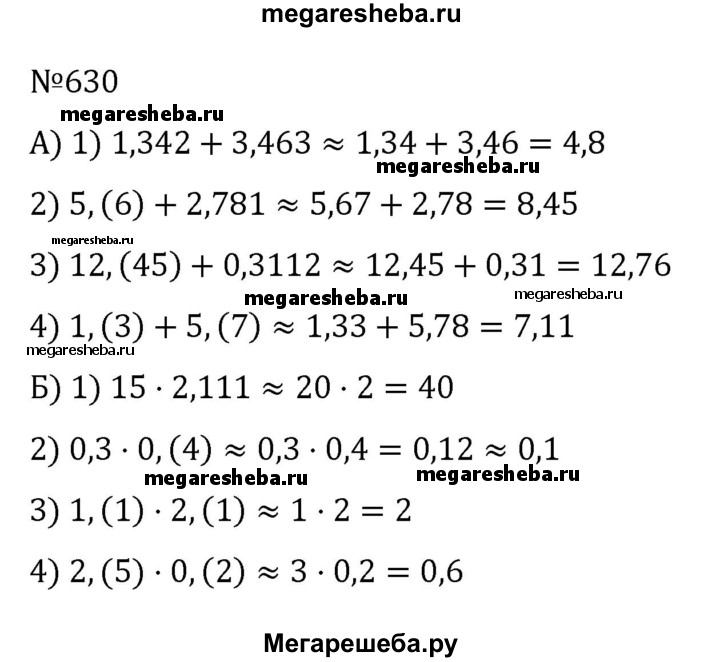630. а) Найдите приближённо сумму чисел, округлив данные числа до сотых: 1) 1,342 + 3,463; 2) 5,(6) + 2,781; з) 12,(45) + 0,3112; 4) 1,(3) + 5,(7). б) Найдите приближённо произведение чисел, округлив данные числа и результат до первой значащей цифры: 1) 15 * 2,(1); 2) 0,3 * 0,(4); 3) 1,(1) * 2,(1); 4) 2,(5) * 0,(2).