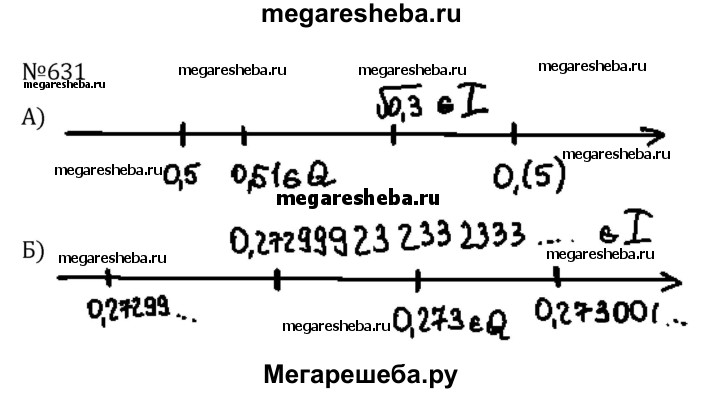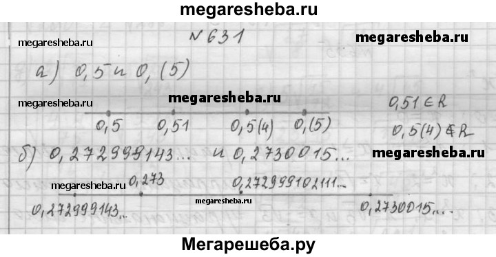 631. На координатной оси укажите одно рациональное и одно иррациональное число, расположенные между числами: а) 0,5 и 0,(5); б) 0,272999143... и 0,2730015... .
