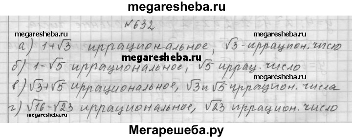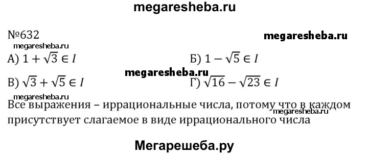 632. Каким числом — рациональным или иррациональным — является значение выражения: а) 1 + √3; б) 1 - √5; в) √3 + √5; г) √16 - √23?