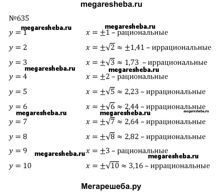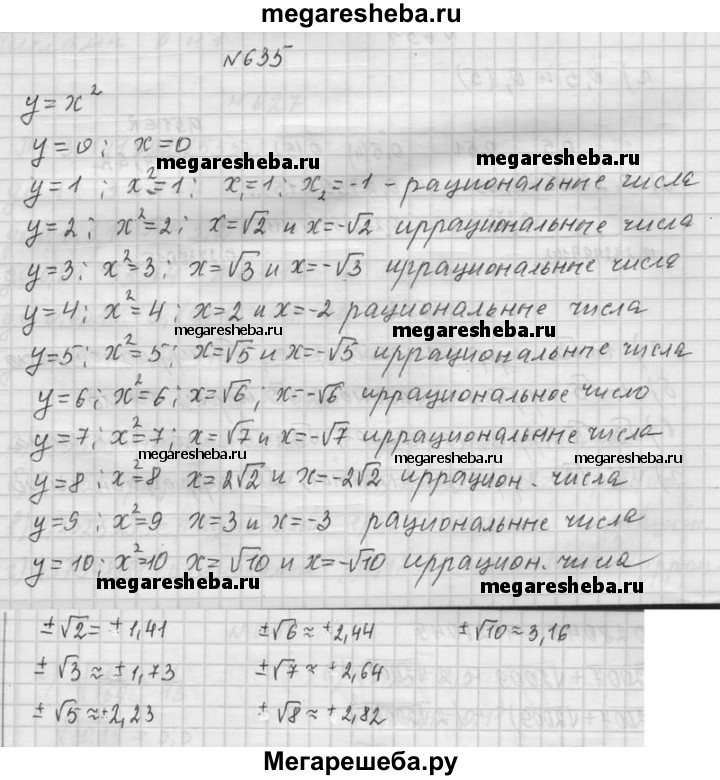 635. Дана функция у = х2. Какими числами — рациональными или иррациональными — являются абсциссы точек графика этой функции, если ординаты этих точек: 0, 1, 2, 3, 4, 5, 6, 7, 8, 9, 10? Найдите приближённые значения иррациональных абсцисс с недостатком с точностью до 0,01.?