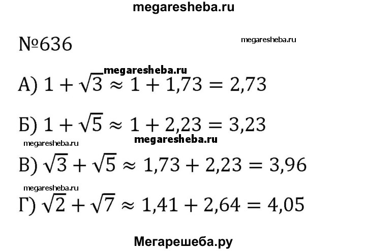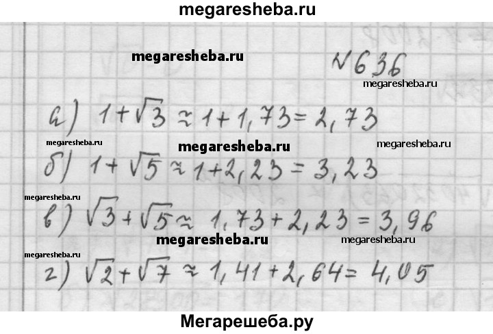 636. Найдите приближённо с недостатком значение выражения, ограничившись двумя знаками после запятой: а) 1 + √З; б) 1 + √5; в) √З + √5; г) √2 + √7.