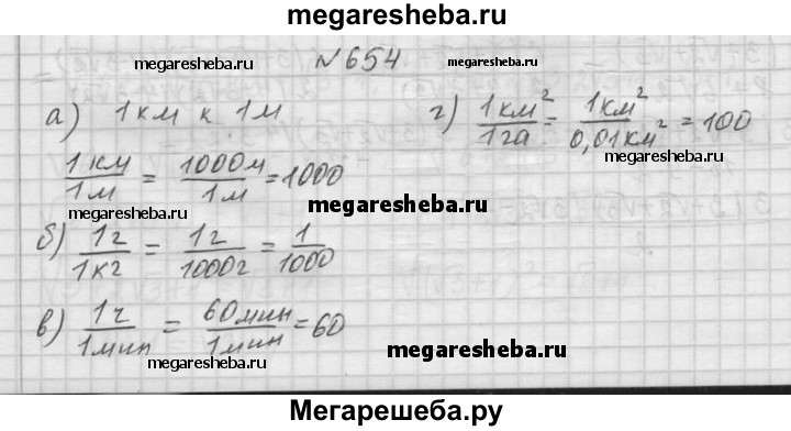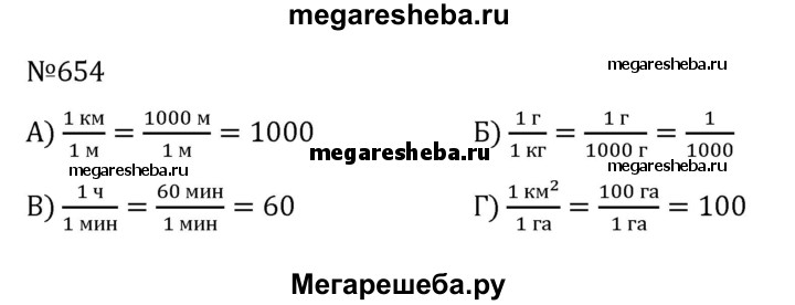 654. Найдите отношение: а) 1 км к 1 м; б) 1 г к 1 кг; в) 1 ч к 1 мин; г) 1 км2 к 1 га.