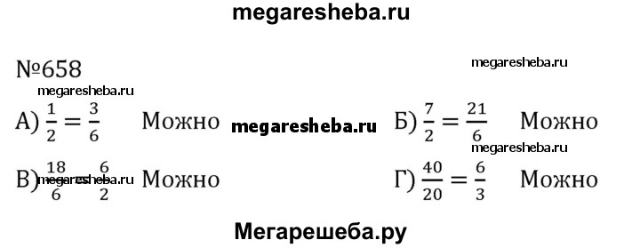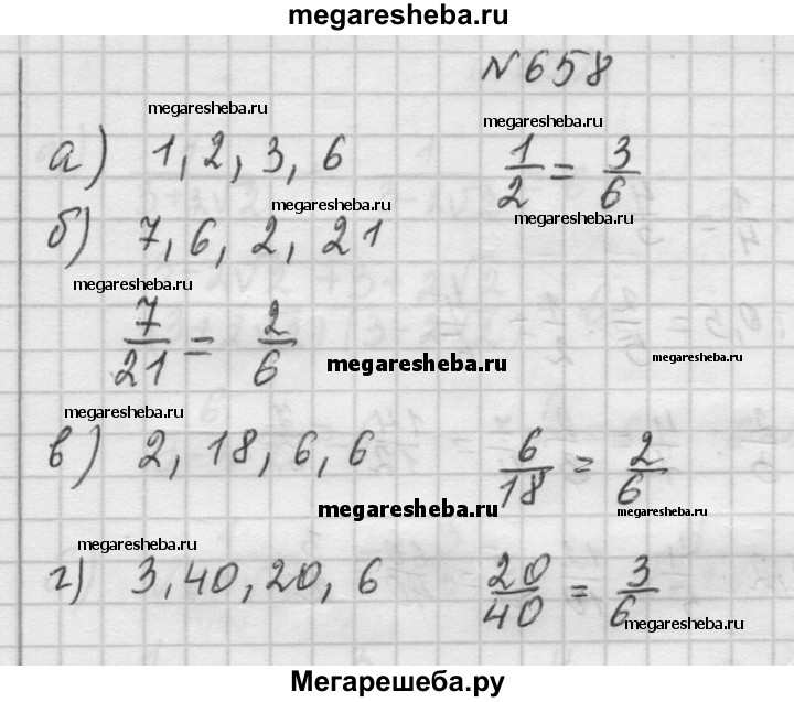 658. Можно ли составить пропорцию из чисел: а) 1, 2, 3, 6; б) 7, 6, 2, 21; в) 2, 18, 6, 6; г) 3, 40, 20, 6?