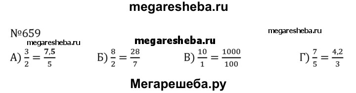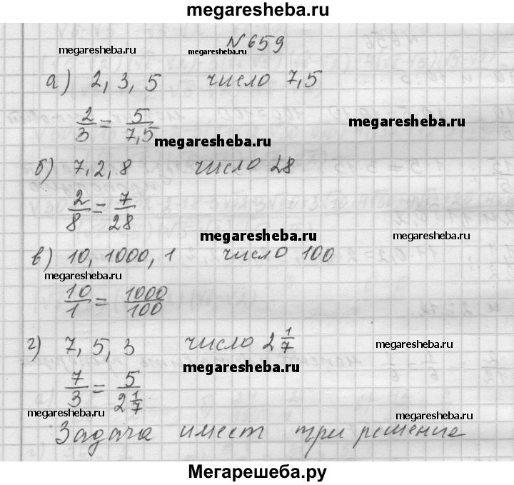 659. К данной тройке чисел подберите такое четвёртое число, чтобы эти числа могли образовать пропорцию: а) 2, 3, 5; б) 7, 2, 8; в) 10, 1000, 1; Сколько решений имеет задача?