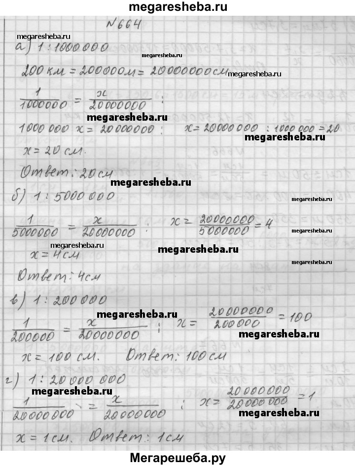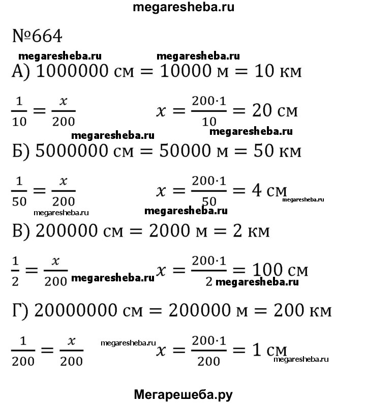 664. Определите длину отрезка, изображающего на географической карте шоссейную дорогу между двумя городами, если на местности длина этого шоссе равна 200 км, а масштаб карты: а) 1 : 1 000 000; б) 1 : 5 000 000; в) 1 : 200 000; г) 1 : 20 000 000.