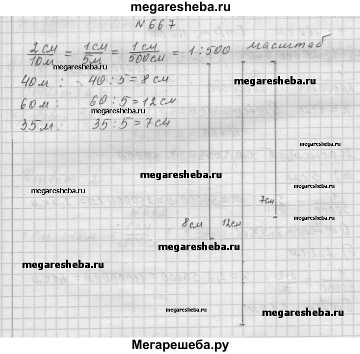 667. Изобразите вертикальными отрезками высоту дома в 40 м, 60 м, 35 м, принимая 2 см за 10 м. В каком масштабе сделан чертёж?