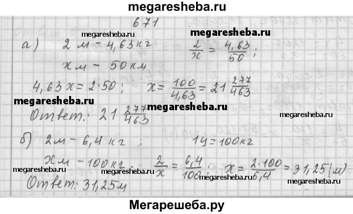 671. а) Масса 2 м стального троса 4,63 кг. Какова длина троса в мотке массой 50 кг? б) Масса 2 м стального троса 6,4 кг. Какова длина троса, если его масса 1 ц?