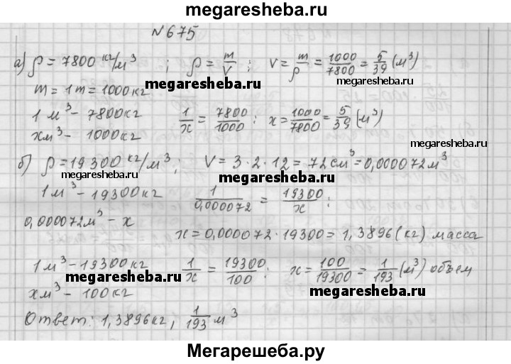 675. а) Плотность железа равна 7800 кг/м3. Каков объём тонны железа? б) Плотность золота равна 19 300 кг/м3. Найдите массу золотого бруска с размерами 3 см, 2 см, 12 см. Каков объём слитка золота в 100 кг?
