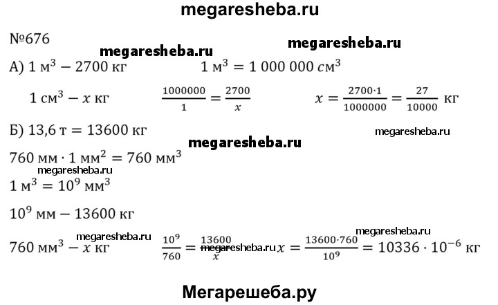 676. а) Масса кубического метра алюминия 2700 кг. Какую массу имеет кубический сантиметр алюминия? б) Кубический метр ртути имеет массу 13,6 т. Какую массу имел бы столб ртути высотой 760 мм, основание которого равно 1 мм2?