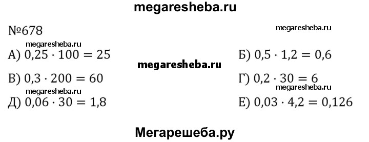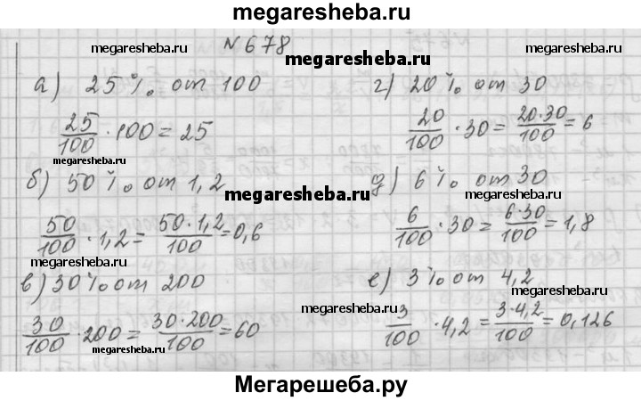 678. Определите: а) 25 % от 100; б) 50 % от 1,2; в) 30 % от 200; г) 20 % от 30; д) 6 % от 30; е) 3 % от 4,2.