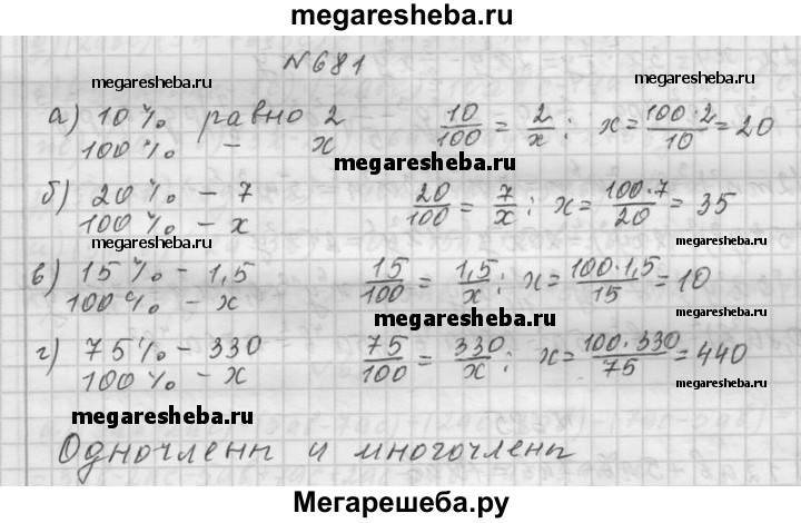681. Определите число: а) 10 % которого составляют 2; б) 20 % которого составляют 7; в) 15 % которого составляют 1,5; г) 75 % которого составляют 330.