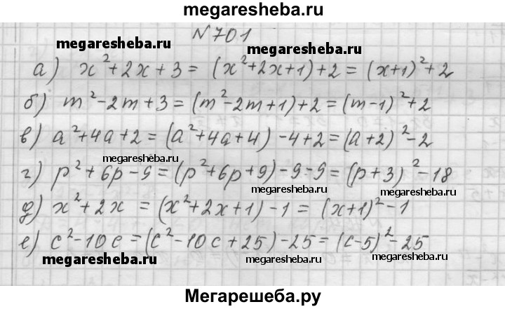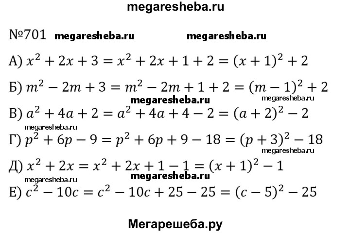 701. Выделите полный квадрат: а) х2 + 2х + 3; б) m2 – 2m + 3; в) а2 + 4а + 2; г) р2 + 6р- 9; д) х2 + 2х; е) с2 - 10с.