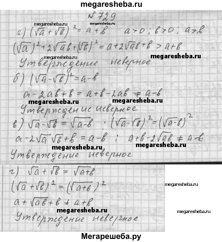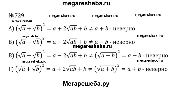 729. Докажите или опровергните утверждение: для любых положительных чисел а и b (а > b) верно равенство: а) (√а + √b)2 = а + b; б) (√a - √b)2 = а - b; в) √a - √b = √a - b; г) √a + √b = √a+b