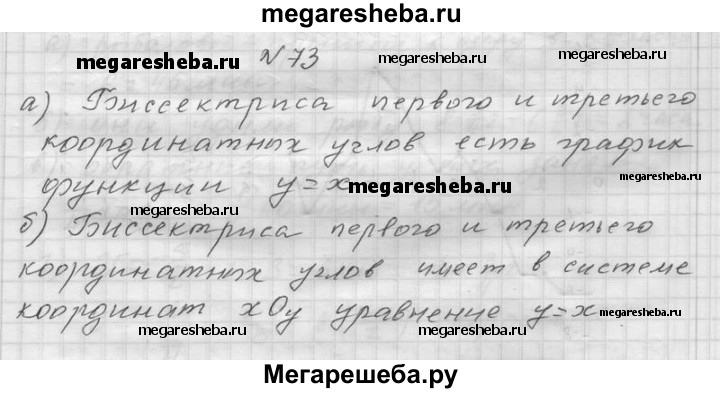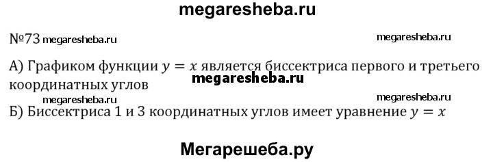 73. а) Что является графиком функции у = х? б) Какое уравнение имеет биссектриса I и III координатных углов?