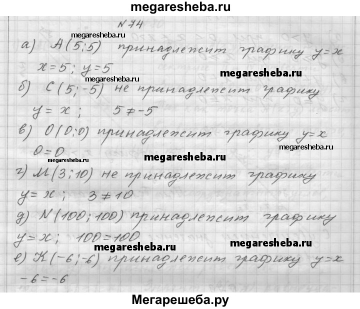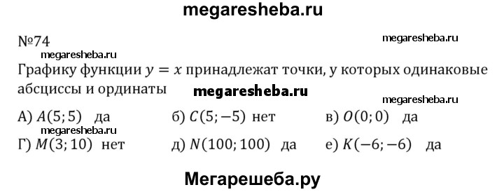 74. Принадлежит ли графику функции у = х точка: а) А(5; 5); б) С(5; -5); в) 0(0; 0); г) М(3; 10); д) N(100; 100); е) К(-6; -6)?