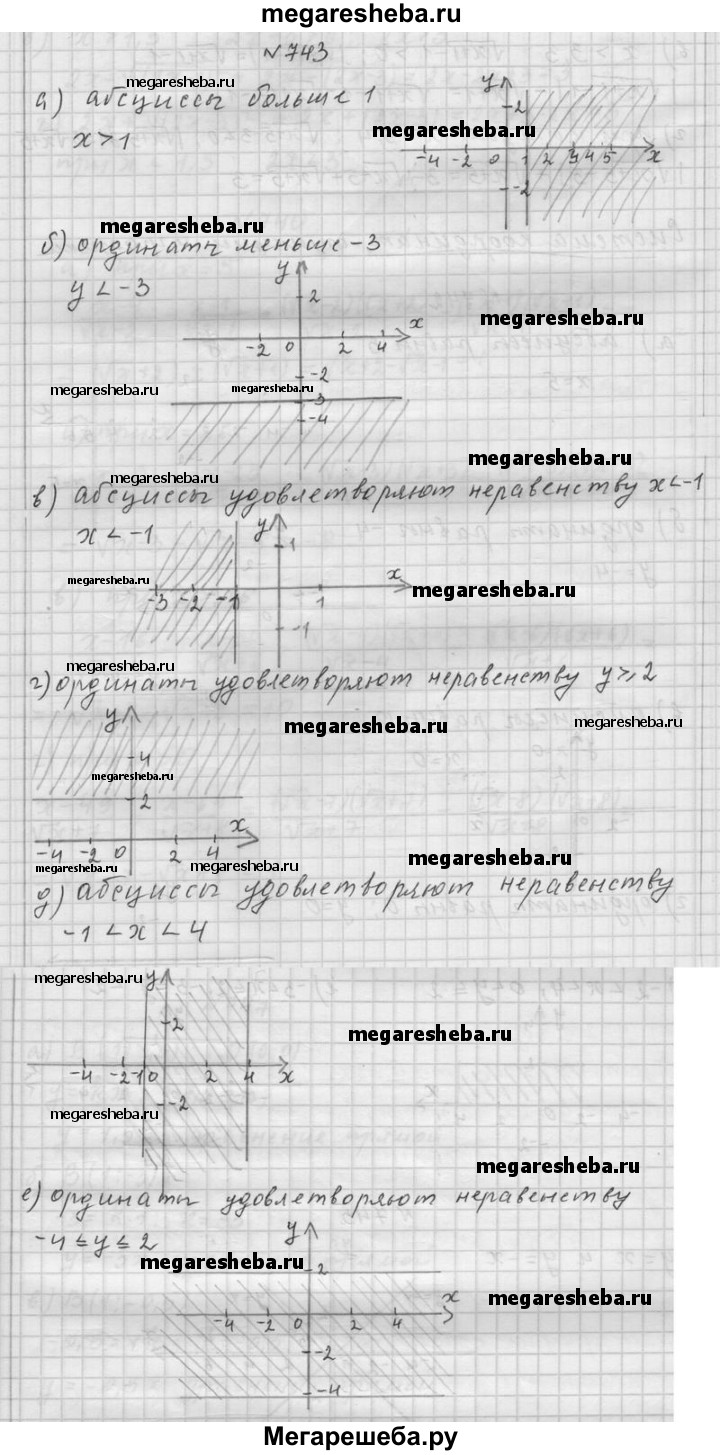 743. На координатной плоскости отметьте все точки, у которых: а) абсциссы больше 1; б) ординаты меньше -3; в) абсциссы удовлетворяют неравенству х < -1; г) ординаты удовлетворяют неравенству у ≥ 2; д) абсциссы удовлетворяют неравенству -1 < х < 4; е) ординаты удовлетворяют неравенству -4 ≤ у ≤ 2.