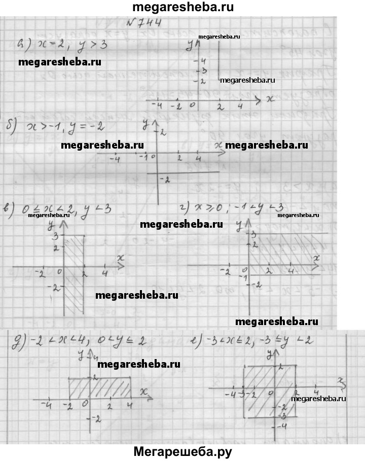 744. Укажите на координатной плоскости точки (х; у), координаты которых удовлетворяют условиям: а) х = 2, у > 3; б) х > -1, у = -2; в) 0 ≤ х < 2, у < 3; г) х ≥ 0, -1 < у < 3; д) -2 < х < 4, 0 ≤ у 2; е) -3 < х ≤ 2, -3 ≤ у < 2.