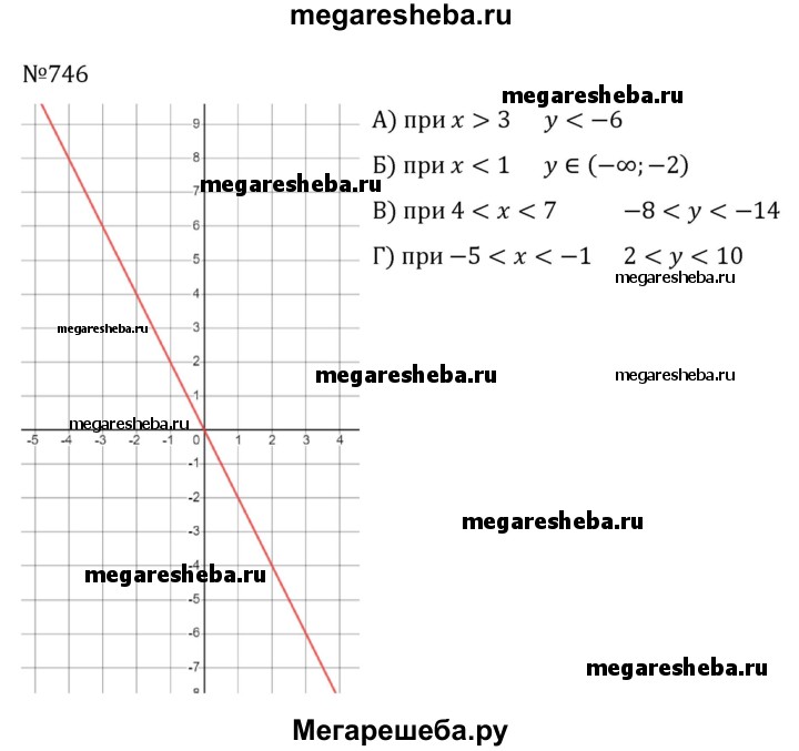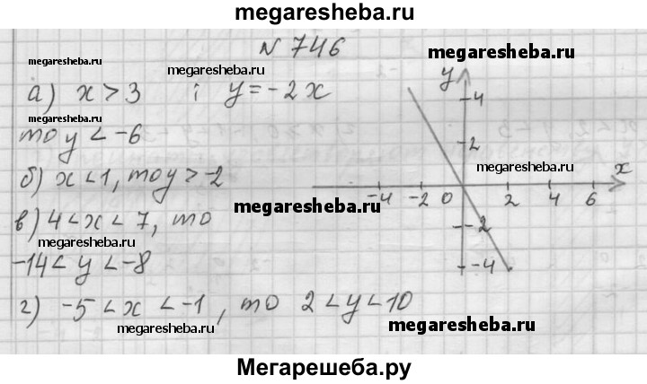 746. Постройте график функции у = -2х. Какие значения принимает у, если: а) х > 3; б) х < 1; в) 4 < х < 7; г) -5 < х < -1?