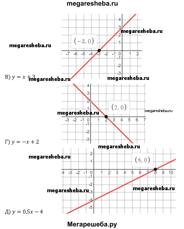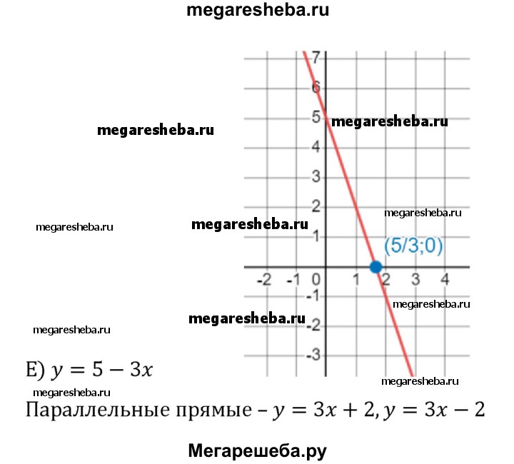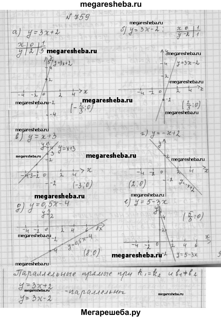 759. Постройте график функции и определите координаты точки, в которой график пересекает ось x: а) у = 3x + 2; б) у = 3x - 2; в) у = х + 3; г) у = -x + 2; д) у = 0,5x - 4; е) у = 5 - 3x. Какие из построенных прямых параллельны?