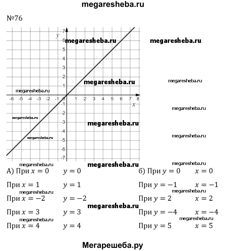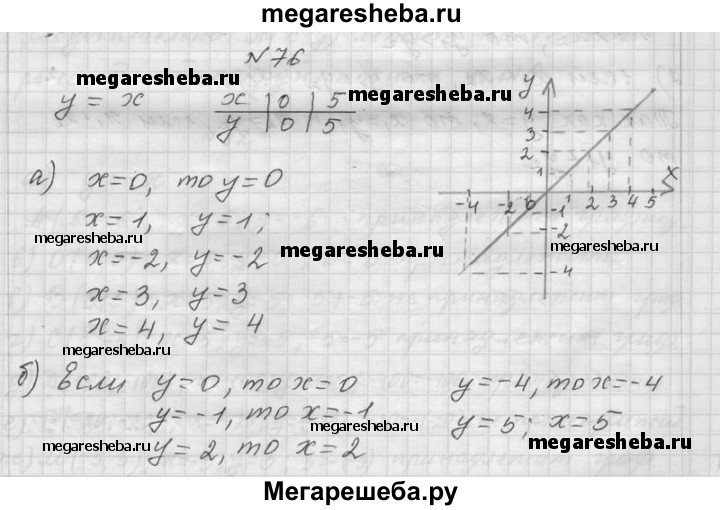 76. Постройте график функции у = х. Определите по графику: а) значение у, соответствующее значению х, равному 0, 1, -2, 3, 4; б) значение х, соответствующее значению у, равному 0, -1, 2, -4, 5.