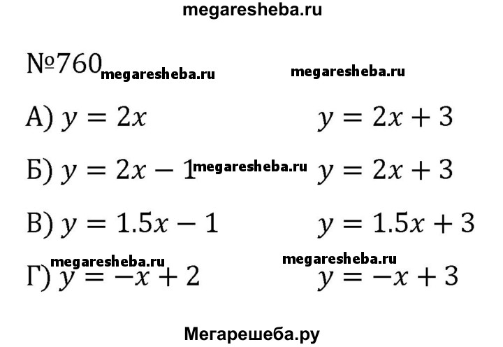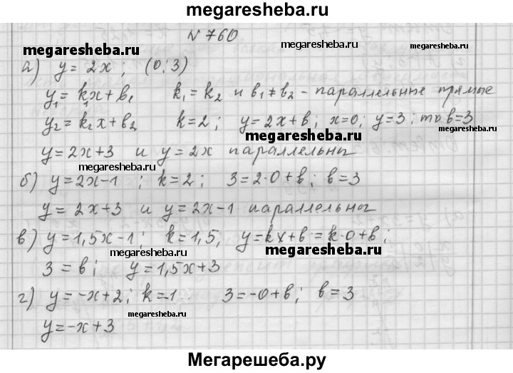 760. Напишите уравнение прямой, проходящей через точку (0; 3) и параллельной прямой: а) у = 2х; б) у = 2х - 1; в) у= 1,5х - 1; г) у = -х + 2.
