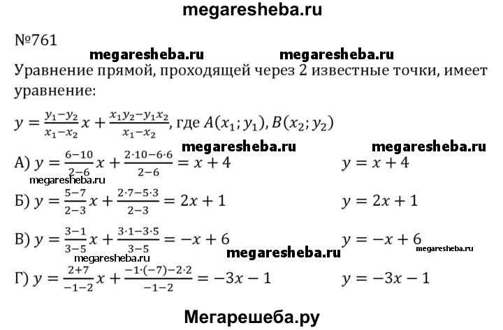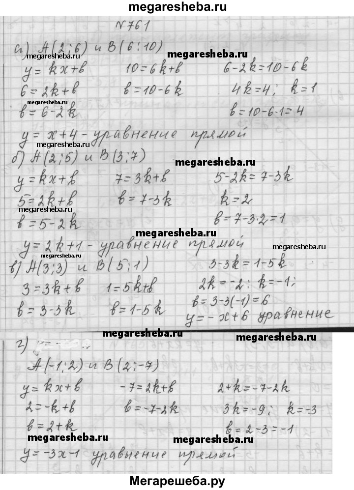 761. График какой линейной функции проходит через точки: а) А (2; 6) и В(6; 10); б) А(2; 5) и В(3; 7); в) А(3; 3) и В(5; 1); г) А(-1; 2) и В(2; -7)?