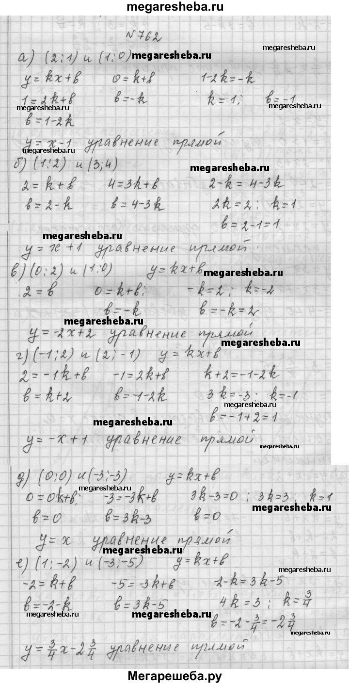 762. Напишите уравнения прямой, проходящей через точки: а) (2; 1) и (1; 0); б) (1; 2) и (3; 4); в) (0; 2) и (1; 0); г) (-1; 2) и (2; -1); д) (0; 0) и (-3; -3); е) (1; -2) и (-3; -5).