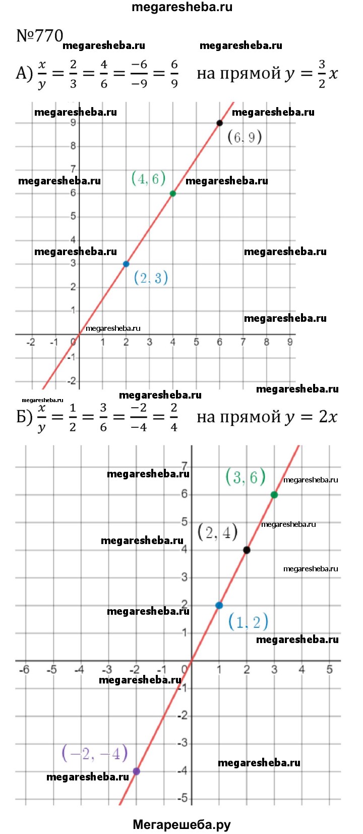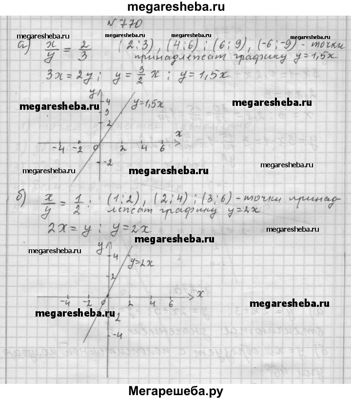 770. Постройте несколько точек, координаты которых удовлетворяют условию: а) x/y = 2/3 б) x/y = 1/2 Где лежат все такие точки?