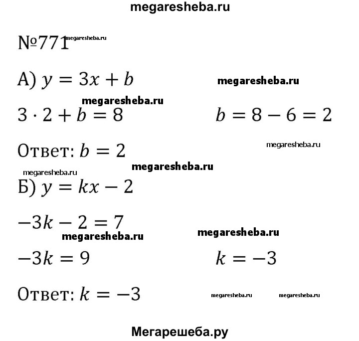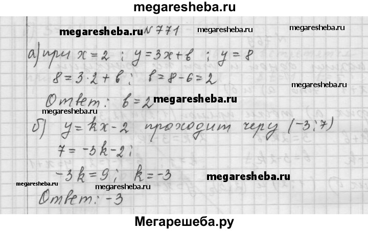 771. а) Известно, что при х = 2 функция у = Зх + b принимает значение 8. Определите b. б) Известно, что график функции у = kx - 2 проходит через точку (-3; 7). Определите k.