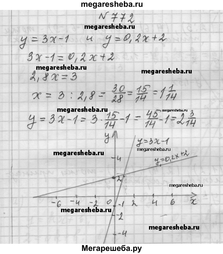 772. Даны две функции: у = Зх - 1 и у = 0,2x + 2. Определите, при каком значении x обе функции имеют одно и то же значение. Проиллюстрируйте решение с помощью графика.