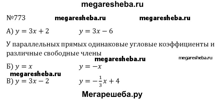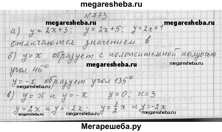 773. а) Приведите примеры линейных функций, графики которых параллельны. Чем отличаются формулы, задающие эти функции? б) Приведите примеры линейных функций, графики которых образуют с положительной полуосью Ох угол в 45°, 135°. в) Приведите примеры линейных функций, графики которых перпендикулярны.