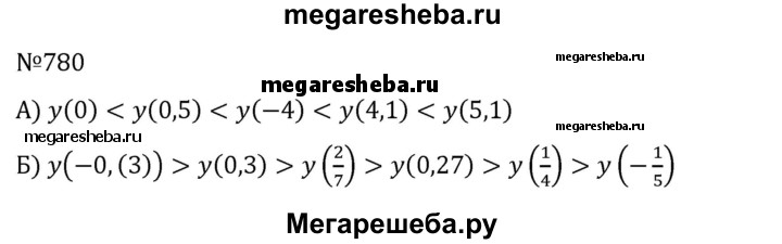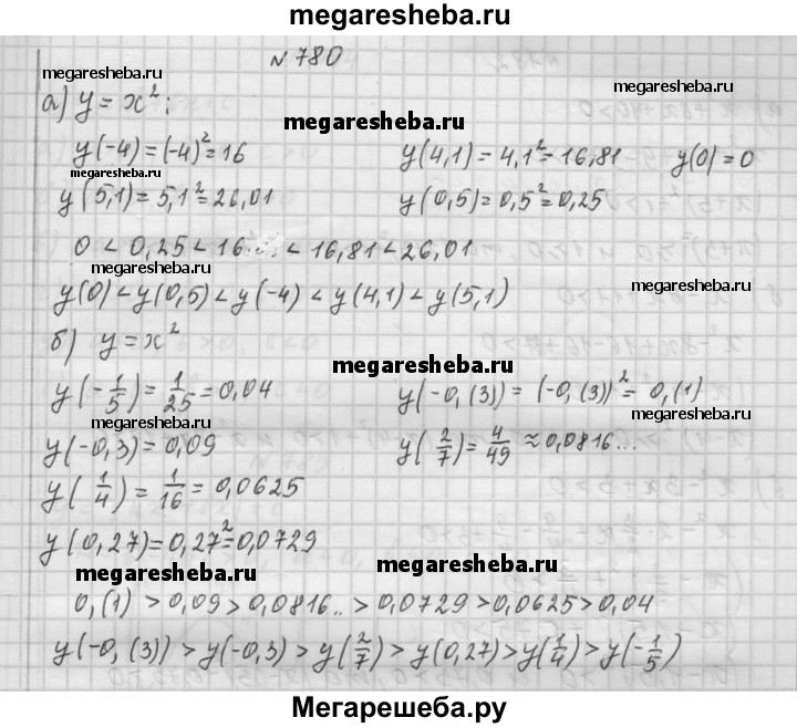 780. а) Расположите значения функции у = х2 в порядке возрастания: у(-4), у(5,1), y(4,1), y(0,5), y(0). б) Расположите значения функции у = х2 в порядке убывания: у(-1/5), y(-0,3), y(1/4), у(0,27),y((-0,(3)), y(2/7)
