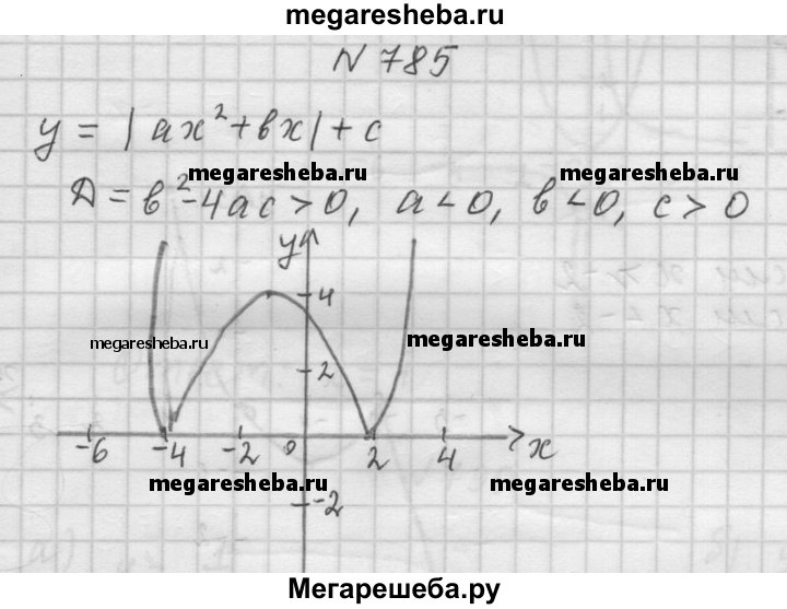 785. Как расположен в координатной плоскости хОу график функции у = | ах2 + bх | + с, если D = b2 - 4ас > 0, а < 0, b < 0, с > О? Постройте схематически график функции.