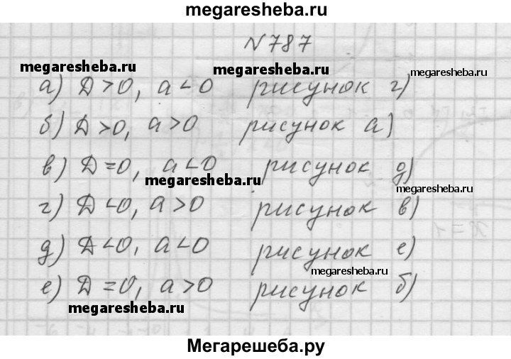 787. На рисунке 117 изображены графики квадратичных функций. Укажите рисунок, удовлетворяющий условию: a) D > 0, а < 0; б) D > 0, а > 0; в) D = 0, а < 0; г) D < 0, а > 0; д) D < 0, а < 0; е) D = 0, а > 0. D — дискриминант, а — коэффициент при старшем члене квадратного трёхчлена ах2 + bх + с.