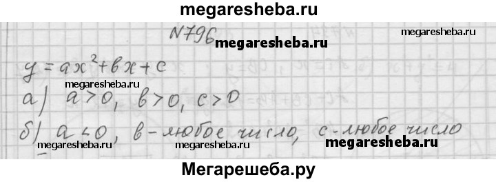 796. Каким условиям должны удовлетворять числа а, b и с, чтобы квадратичная функция у = ах2 + bх + с имела: а) положительные значения при любых х; б) наибольшее значение?
