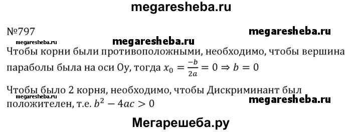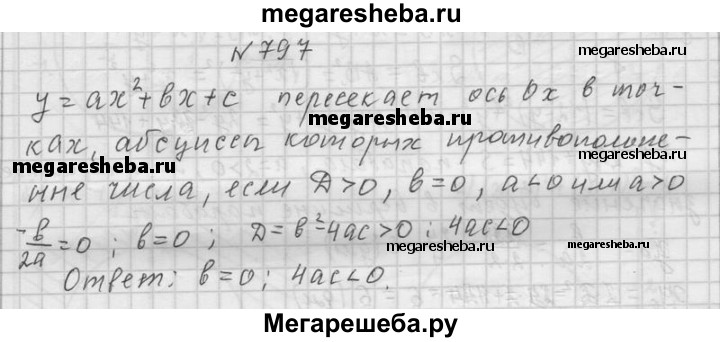 797. При каком условии график квадратичной функции у = ах2 + bх + с пересекает ось Ох в точках, абсциссы которых являются противоположными числами?