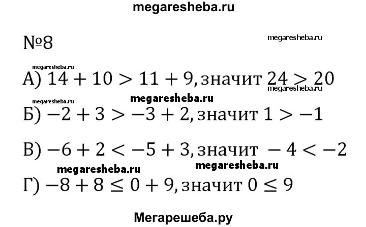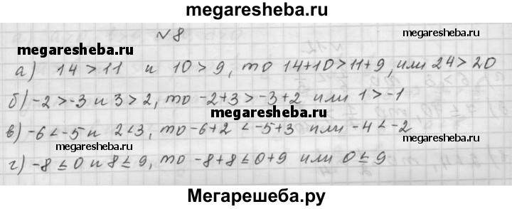 8. Сложите верные числовые неравенства: а) 14 > 11 и 10 > 9; б) -2 > -3 и 3 > 2; в) -6 < -5 и 2 < 3; г) -8 ≤ 0 и 8 ≤ 9.