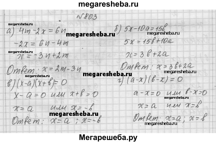 803. Считая m, n, а и b данными числами, решите уравнение с неизвестным х: a) 4m - 2х = 6n; б) 5x - 10а = 15b; в) (х - а)(х + b) = 0; г) (а - х)(6 - х) = 0.