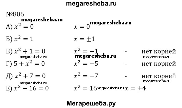 806. Существует ли значение х, при котором: а) х2 = 0; б) х2 = 1; в) х2 + 1 = 0; г) 5 + х2 = 0; д) х2 + 7 = 0; е) х2 - 16 = 0?