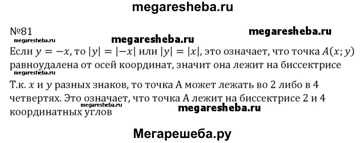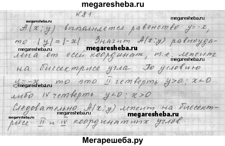 81. Пусть для координат точки А(х; у) выполняется равенство у = -х. Докажите, что эта точка лежит на биссектрисе II и IV координатных углов.?