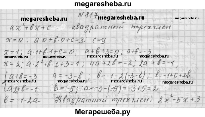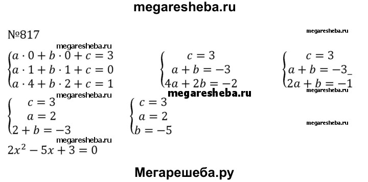 817. Найдите квадратный трёхчлен, значение которого при х = 0 равно 3, при х = 1 равно 0, при х = 2 равно 1.
