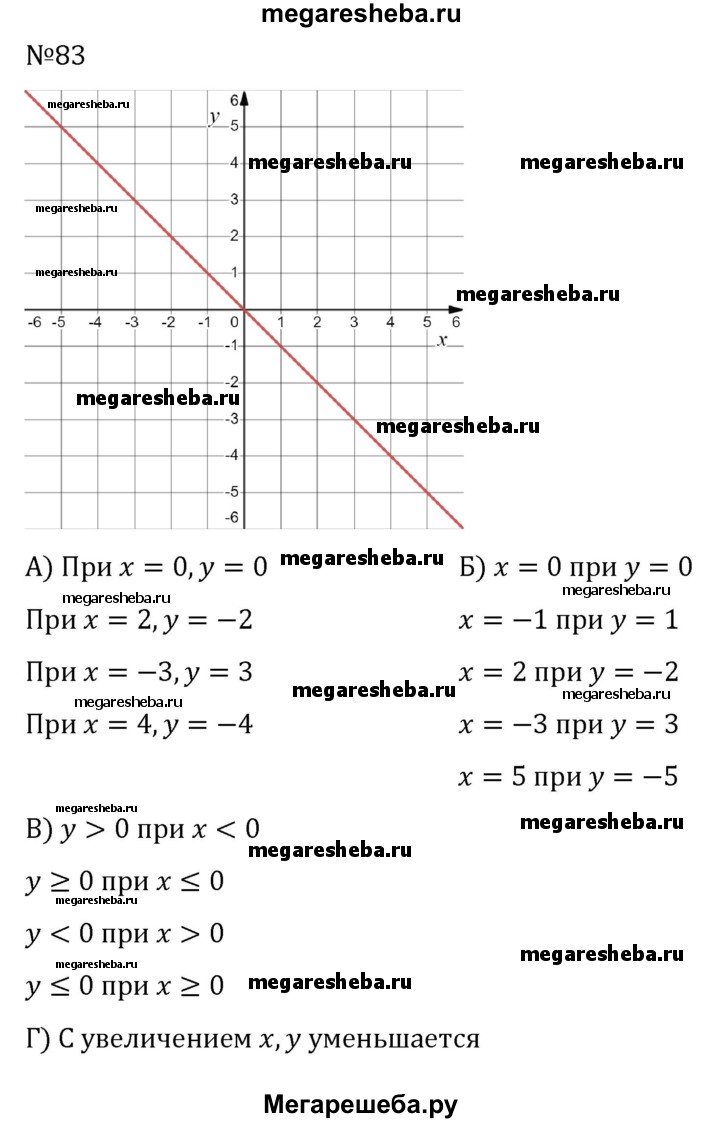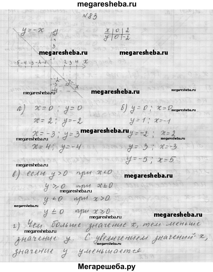 83. Постройте график функции у = -х. Определите по графику: а) значение у, соответствующее значению х, равному 0, 2, -3, 4; б) значение х, соответствующее значению у, равному 0, 1, —2, 3, —5; в) при каких значениях х выполняется неравенство: у > 0, у ≥ 0, у < 0, у ≤ 0; г) увеличивается или уменьшается у с увеличением х.