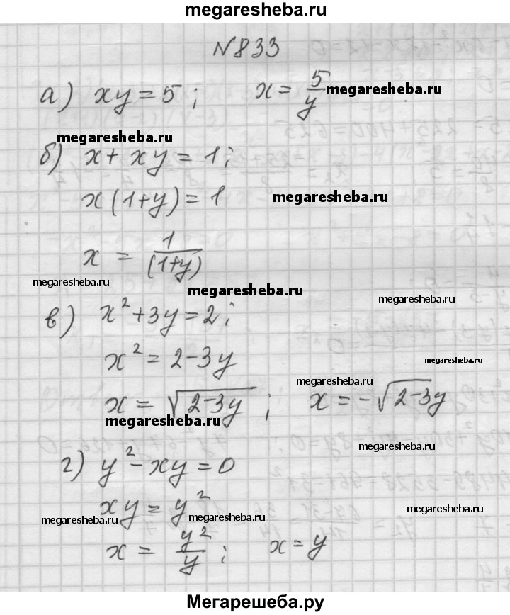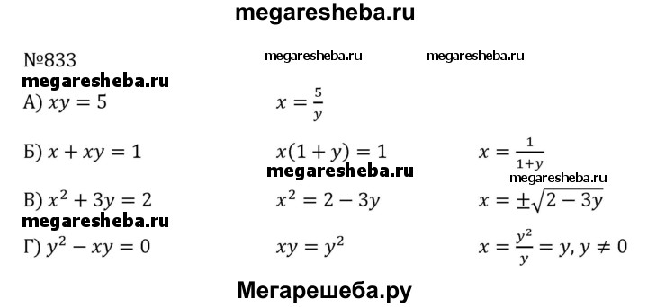 833. Выразите х из уравнения: а) ху = 5; б) х + ху = 1; в) x2 + 3y = 2 г) y2 – xy = 0