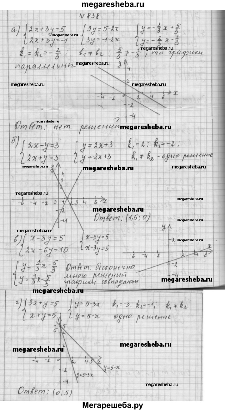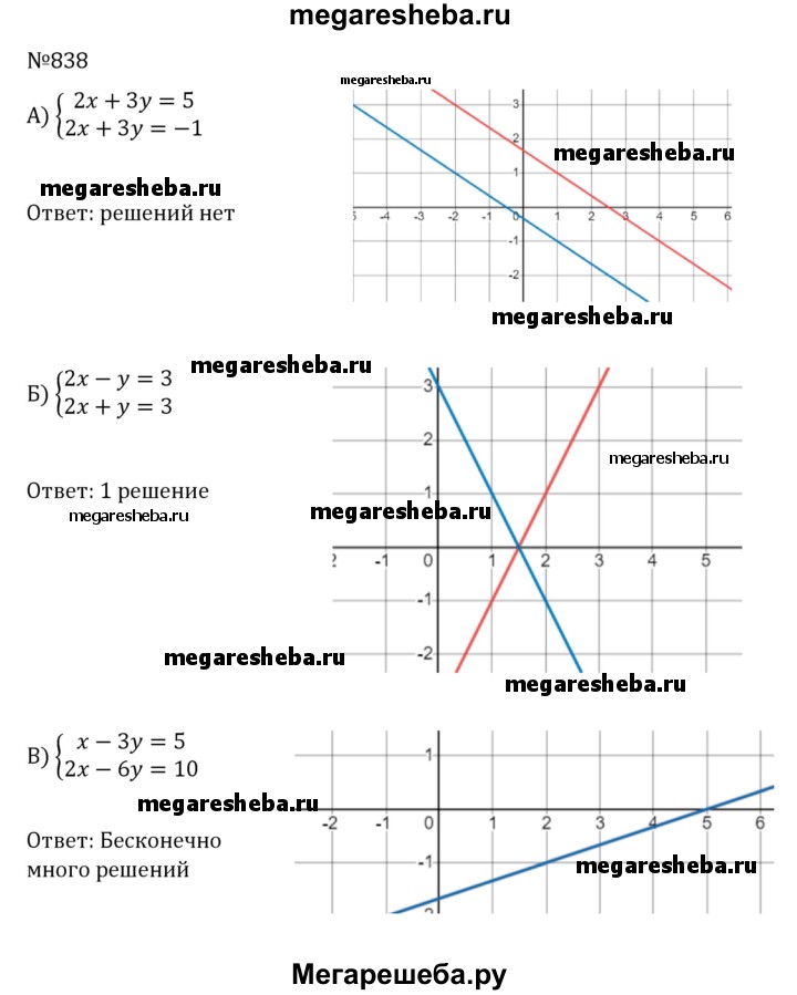 838. Определите, сколько решений имеет система уравнений, и дайте объяснение решения с помощью графиков