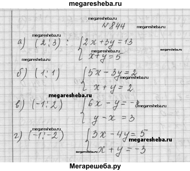 844. Составьте систему двух уравнений с двумя неизвестными, решением которой являлась бы пара чисел: а) (2; 3); б) (1; 1); в) (-1; 2); г) (-1; -2).