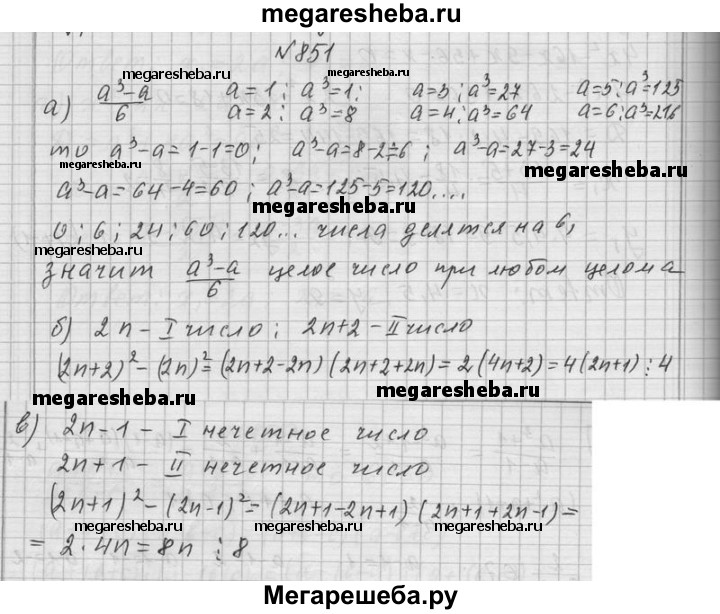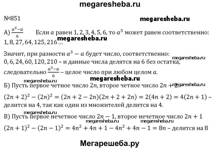 851. а) Докажите, что a2 – a / 6 является целым числом, если а — любое целое число. б) Докажите, что разность квадратов двух последовательных чётных чисел делится на 4. в) Докажите, что разность квадратов любых двух нечётных чисел делится на 8.