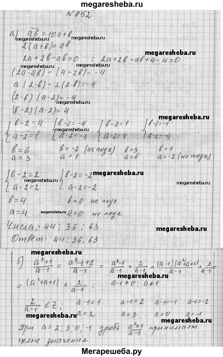 852. Исследуем. а) В каком двузначном числе удвоенная сумма цифр равна их произведению? б) Найдите все целые значения а, при каждом из которых дробь a3 + 1 / a – 1 принимала бы целые значения.