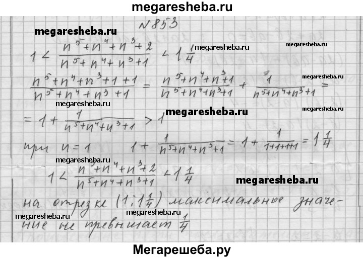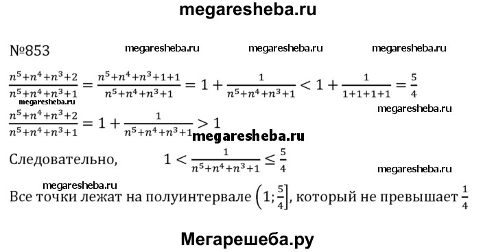 853. Докажите, что точки координатной оси, соответствующие числам вида n5 + n4 + n3 + 2/ n5 + n4 + n3 + 1 , (n — натуральное число), расположены на отрезке, длина которого не превышает 1/4.