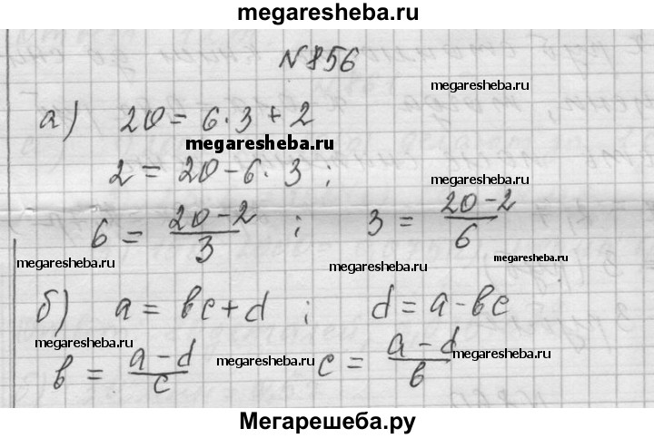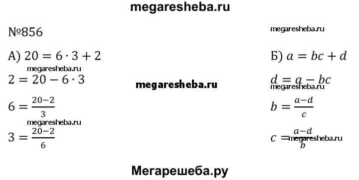 856. а) При делении 20 на 6 в частном получается 3, а в остатке 2. Запишите соответствующее равенство. Выразите каждое число из этого равенства через другие. б) Выразите формулой зависимость между делимым а, делителем b, частным с и остатком d. Выразите каждое число через остальные из этой формулы.